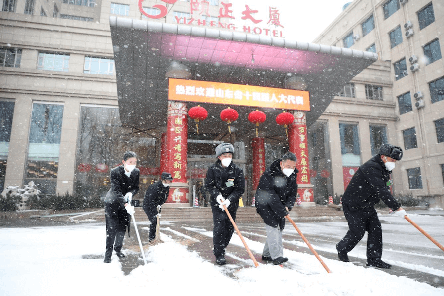 会议期间,济南迎来了2023年的第一场瑞雪。为保障代表的出行安全,早上7点天还未亮,taptap点点体育宾馆各部室员工已然汇聚在宾馆院内的各个主要干道,奋力清扫积雪,铲除薄冰,保障会议通道顺畅。代表们到达俱乐部,服务人员为他们轻拂去身上的雪花,尽显“雪中温情”。山东大厦即时启动应急预案,凌晨集结进行除雪,并得到济南市机扫大队与驻地武警官兵们的支持与帮助。颐正大厦后勤保障部门24小时坚守岗位,随时待命。安保人员全天紧盯大厦内外每一个角落,确保不遗留任何隐患;会前协同燃气、消防、供电、电梯等关键部门对各区域重点设施设备进行了专项检测和维护,会议期间全程跟进,确保设备正常运行,各项工作井然有序。