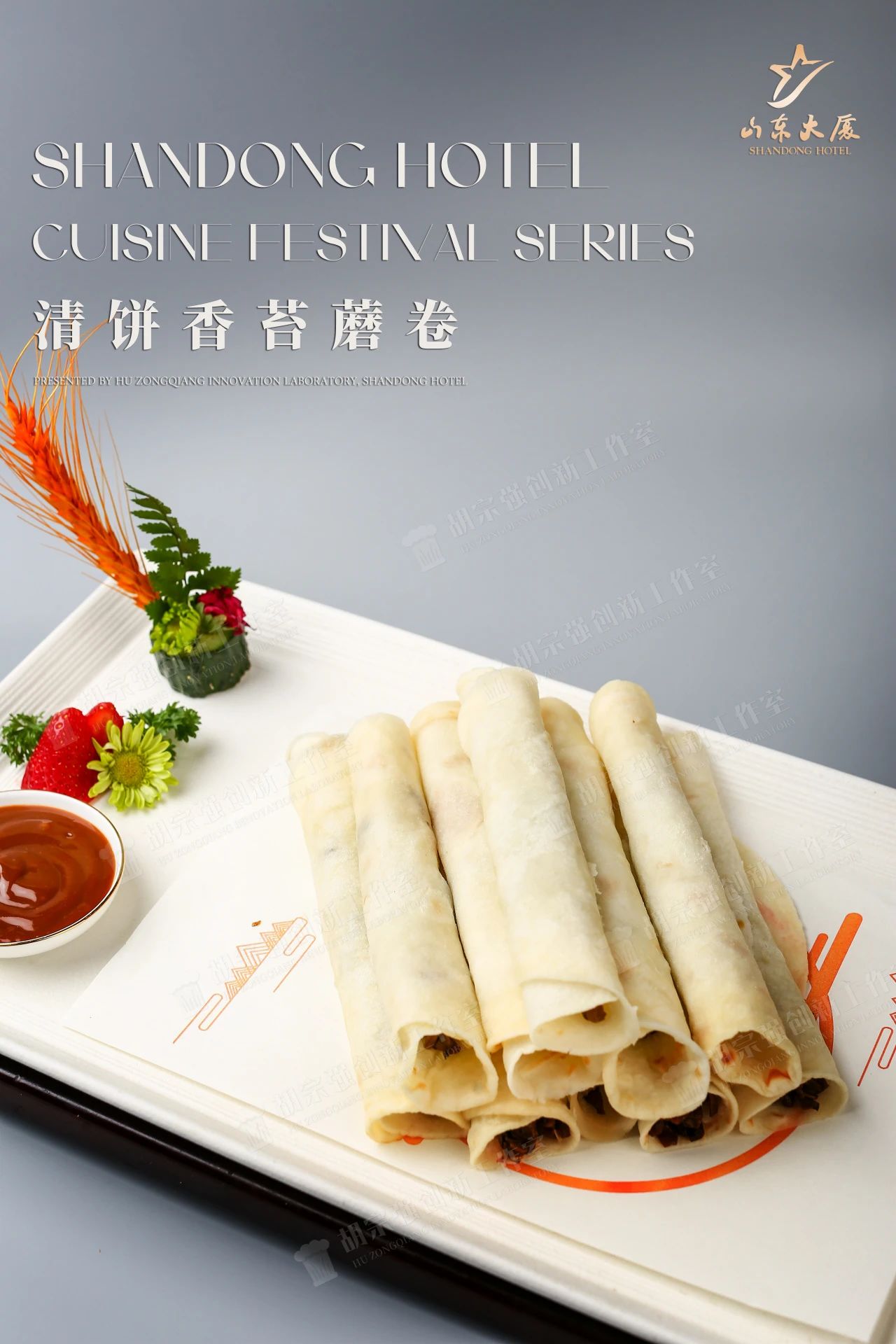 清饼香苔蘑卷 菜品文化典故融合了山西五台山台蘑的珍稀属性与晋商饮食智慧,其雏形可追溯至唐宋时期五台山寺庙斋宴,元代《日用本草》已载其"形类松花而大,香气如簟",唐宋时便为皇家贡品。