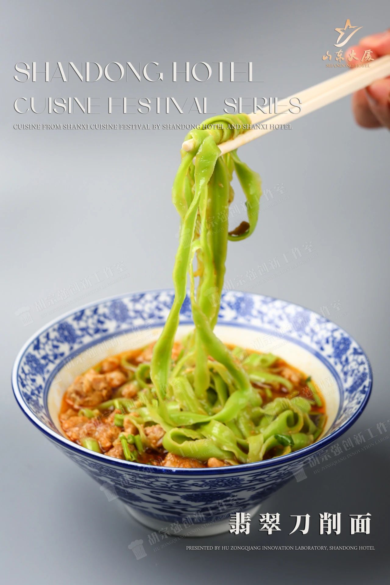 翡翠刀削面 脱胎于唐代驸马柴绍所创刀削面技艺,其"翡翠"色泽源自三晋民间的养生智慧——将菠菜汁融入面团,以春日新摘菠菜榨汁和面,削出的碧绿面条配以山菌高汤,既延续"柳叶乘风"的古法形韵,又以翠色暗合"春山叠翠"的自然美学,成为兼具传统与创新的面艺臻品。