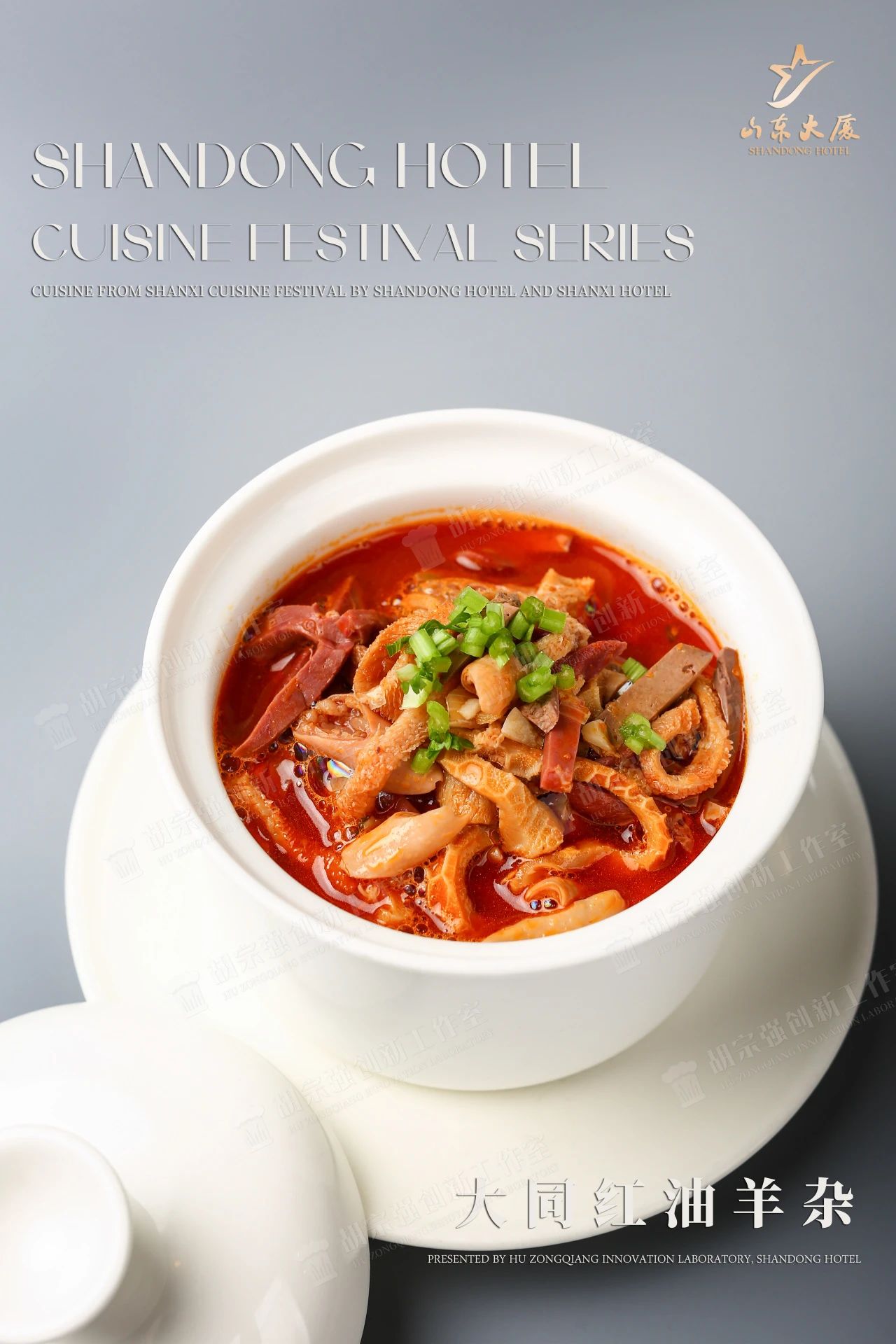 大同红油羊杂 相传元世祖忽必烈之母庄圣太后染疾时,名医许国桢之母韩氏将蒙古人弃用的羊杂洗净,佐以葱椒烹煮献膳,太后食后痊愈赐名”羊杂割“。此菜融入本地粉条与胡麻油增香,具有"杂碎绵软、汤醇不膻"的特点。
