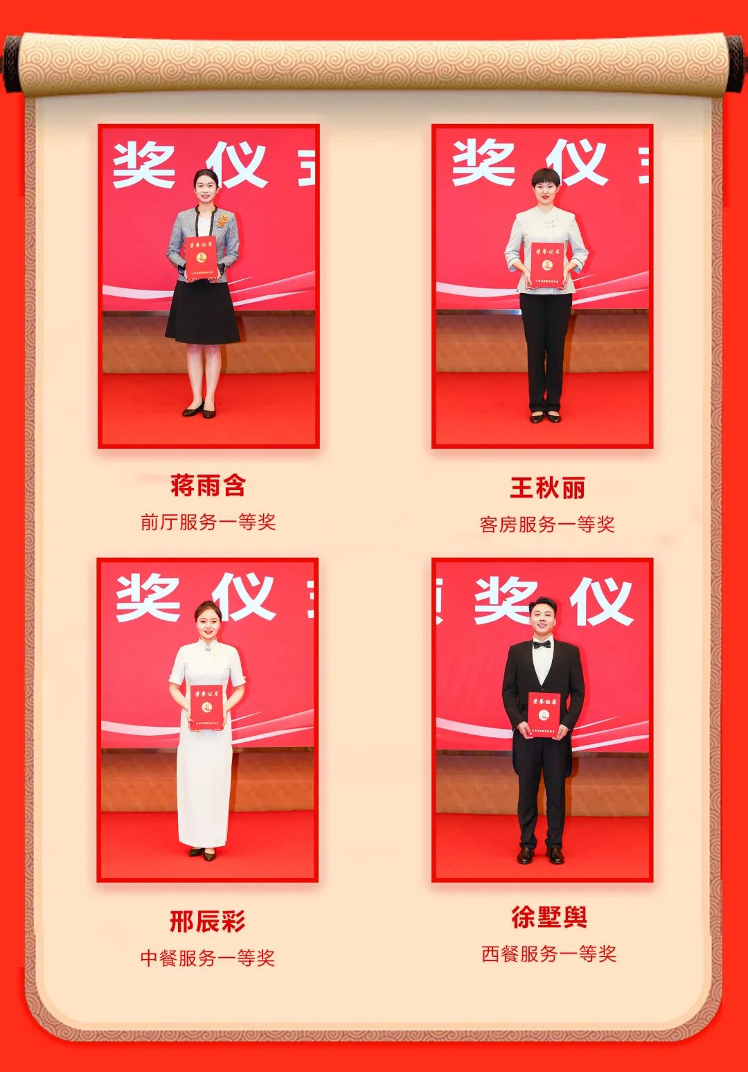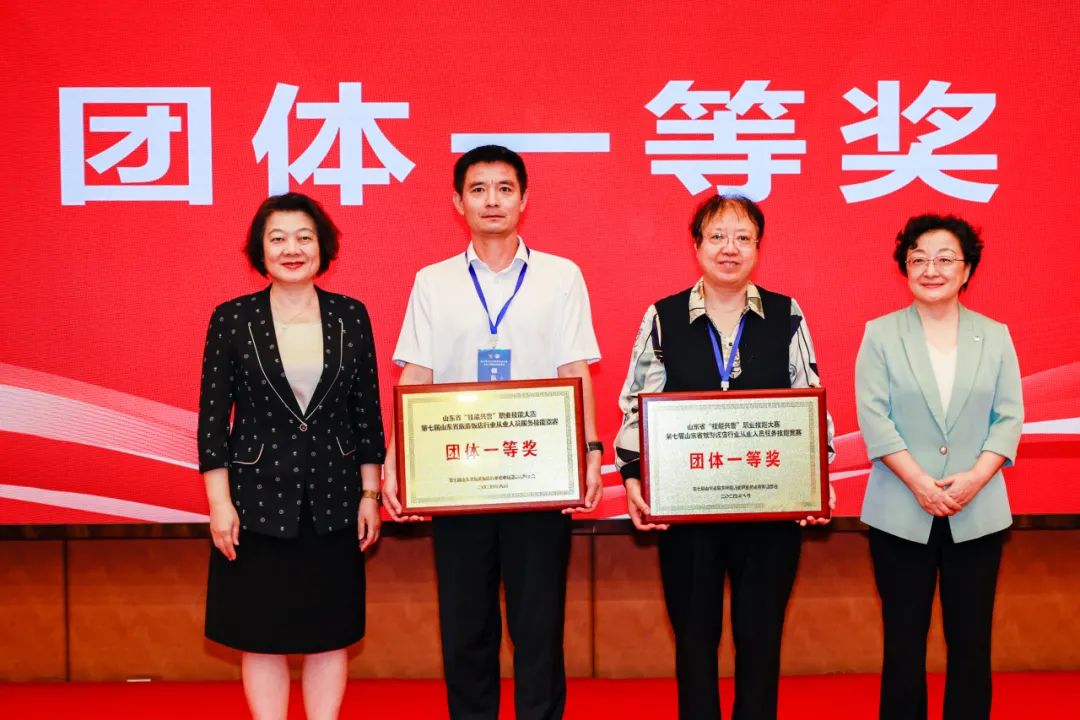 经过两天的激烈角逐,山东大厦选派的蒋雨含、王秋丽、邢辰彩、徐墅舆4名参赛选手,凭借在理论考核、技能操作、英语服务能力、突发事件处理能力等环节中扎实过硬的技艺和自信从容的表现脱颖而出,蝉联团体一等奖,并荣获前厅接待服务、客房服务、中餐服务、西餐服务全部四个比赛项目第一名的好成绩。