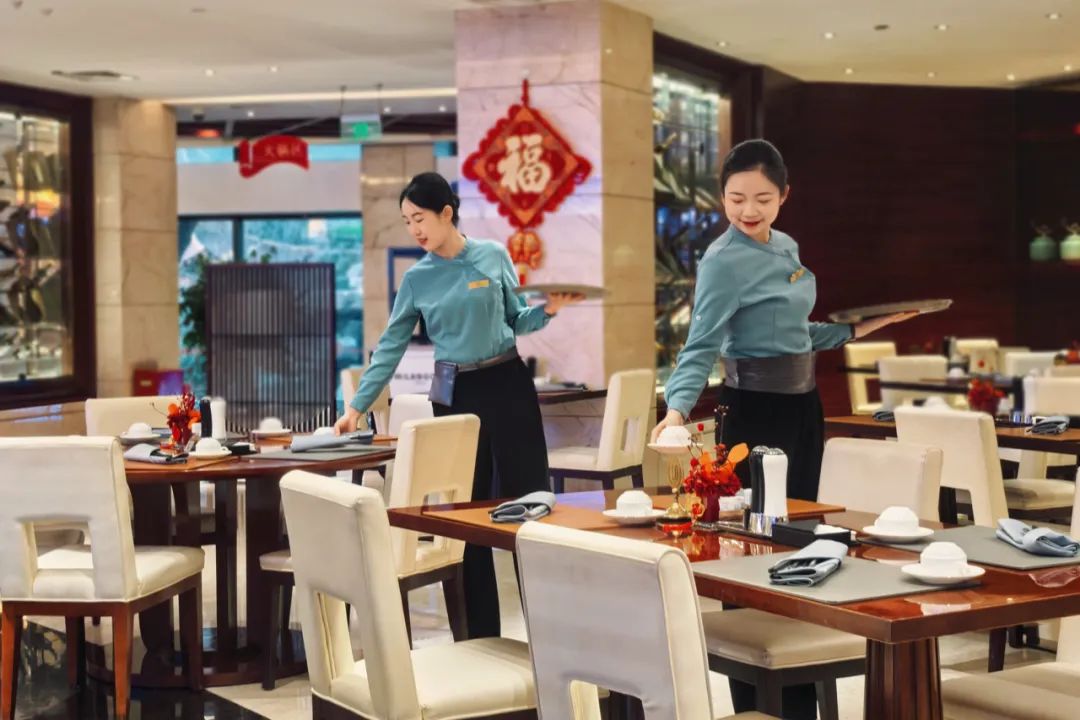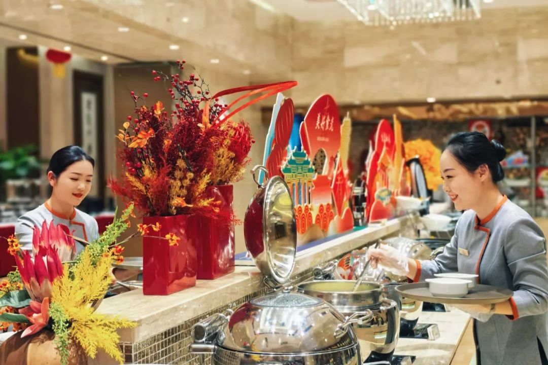 前厅部组建“金牌礼宾”队伍,佩戴特定“橙心诚意”胸花,以红色腊梅点缀橙色玫瑰,预祝与会嘉宾蛇年吉祥如意,平安和顺。茶水台配有多款暖冬饮品和具有山东各地文化特色的小食,步入大堂即感受到如沐春风般的温暖亲切。