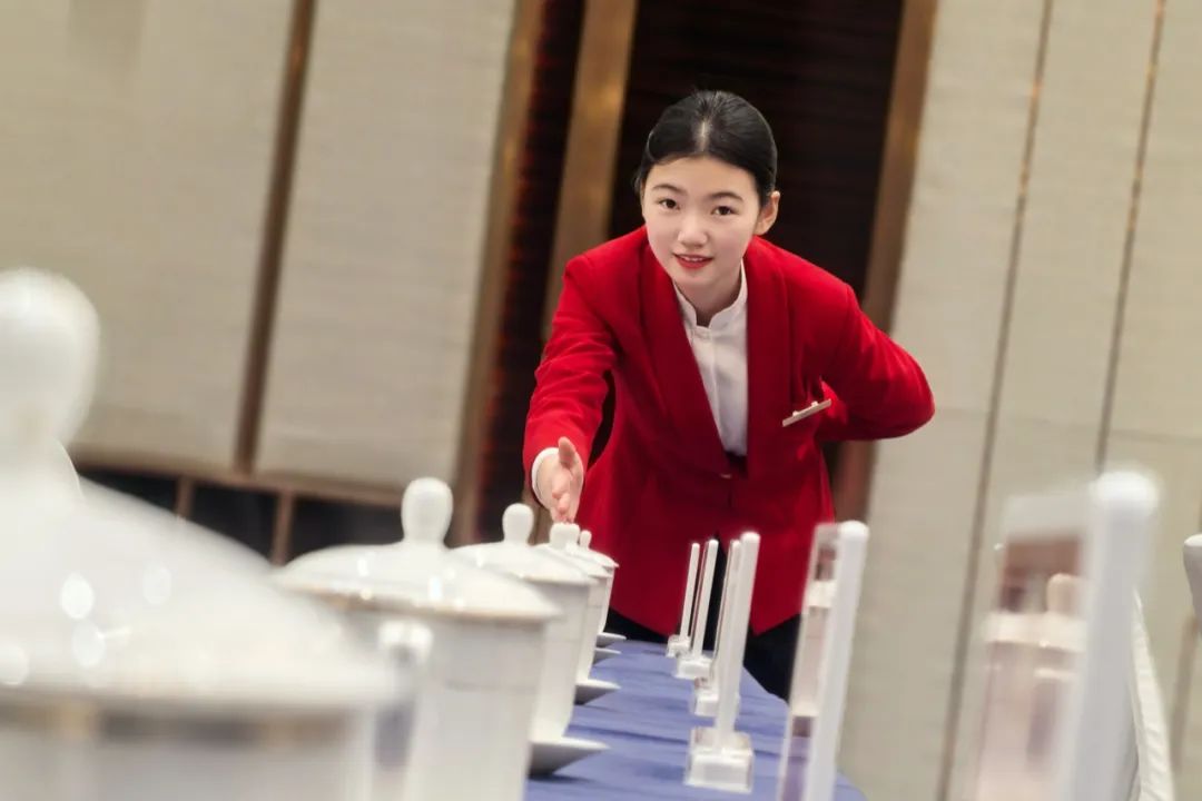 “斟水秀”是会议中心会议接待中的独特环节,看似简单的倒茶水流程,被细化分解为20多个步骤。从行到止,从调到斟,再到水温、水量,每一个环节都严谨有序,为服务增添了艺术的美感。