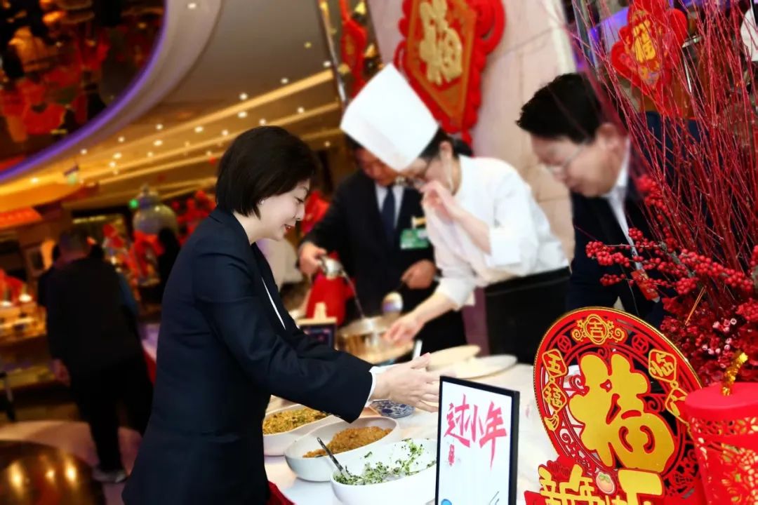 年关将至,各餐厅用心营造浓郁的节日氛围:旺旺“迎春纳福”春意展台,祝福“人寿年丰、家国兴旺”;“巳巳如意”台面主题,寓意牢记嘱托、感恩奋进,锚定“走在前、挑大梁”的担当。恰逢小年,与会来宾无法与家人团聚,餐厅布置了DIY水饺操作台,大家一起包水饺,如同回到家庭大厨房,其乐融融共度小年夜。