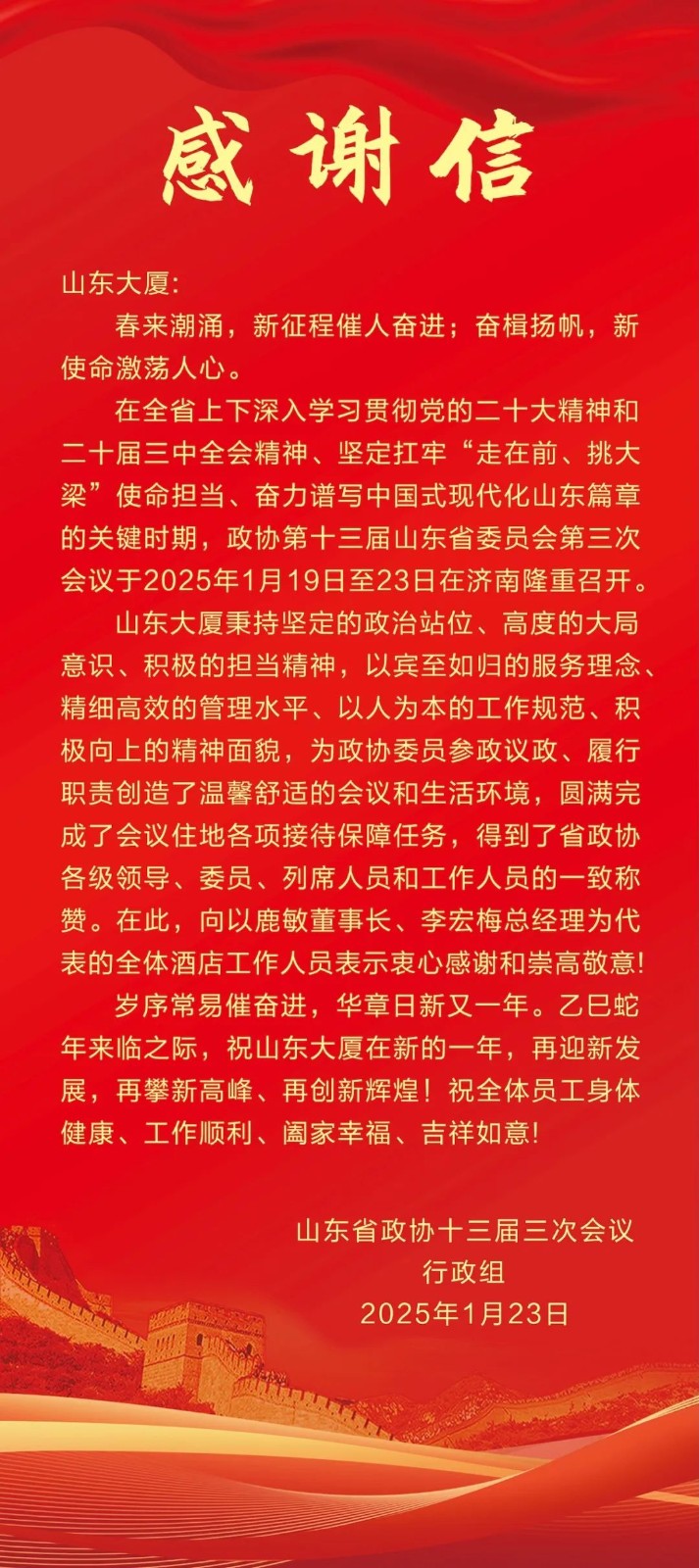 会议保障任务圆满完成,山东大厦再一次交出了令人满意的答卷,再一次展现了大厦人真诚好客的热忱和专业过硬的品质。一封封载满温暖的感谢信和锦旗纷至沓来,这既是对全体干部员工辛勤工作的褒奖,更是对大厦人奋楫笃行、再启新程的鞭策。