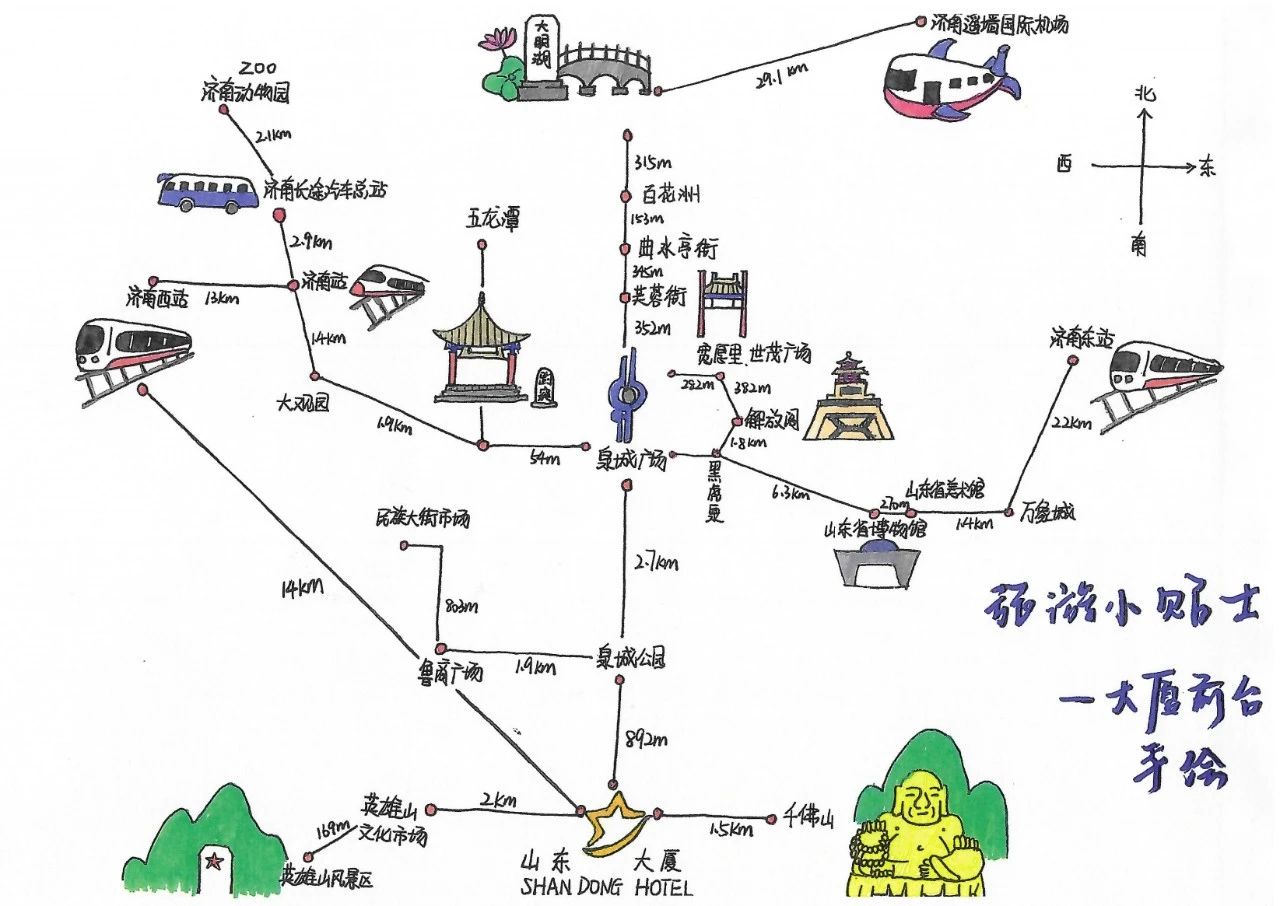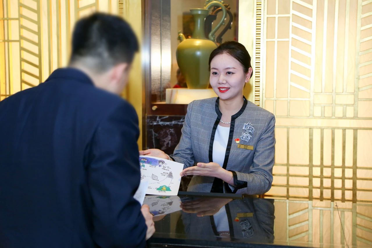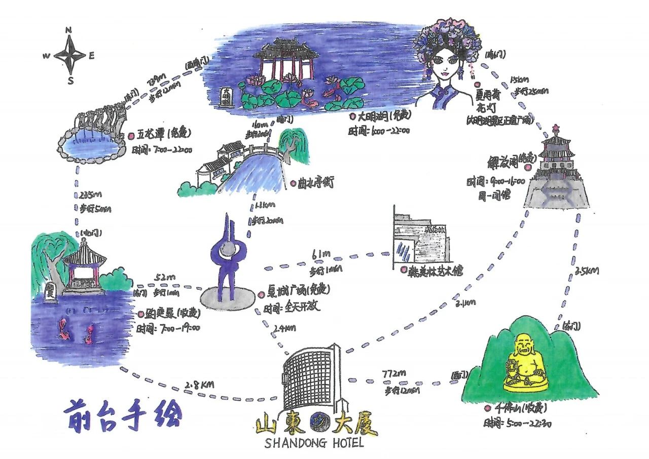 五一假期来到山东大厦,第一眼就看到前厅布置的打卡印章展台,备有雕刻着济南元素的印章,往来宾客可在此盖章留念,收藏一份泉城春日的专属记忆,展台旁新设了茶饮角,沁凉的柠檬薄荷水与各类花茶,随时为风尘仆仆的旅人拂去疲惫。前台摆放着员工手绘的《泉城漫游指南》,用不同颜色标注出景点路线,深受宾客欢迎。
