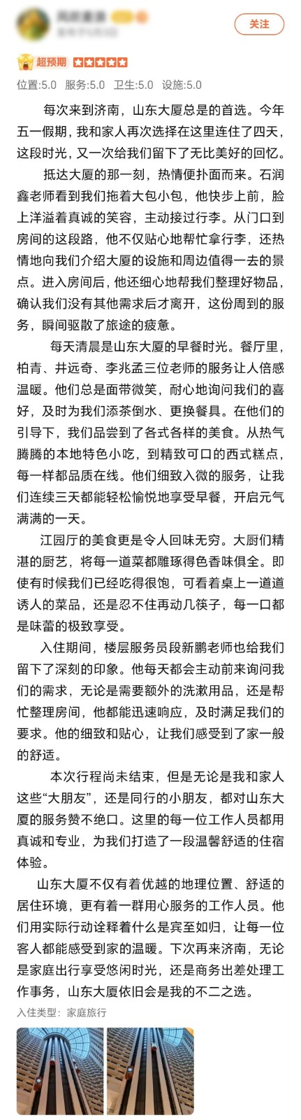 从晨光熹微到灯火阑珊,每一位大厦人坚守岗位,以专业与热情续写假日华章,为每一位宾客带去超越期待的,个性化服务和入住体验,让每一位入住酒店的宾客都有温馨舒适,宾至如归的感受,再次收获大波真挚的好评。