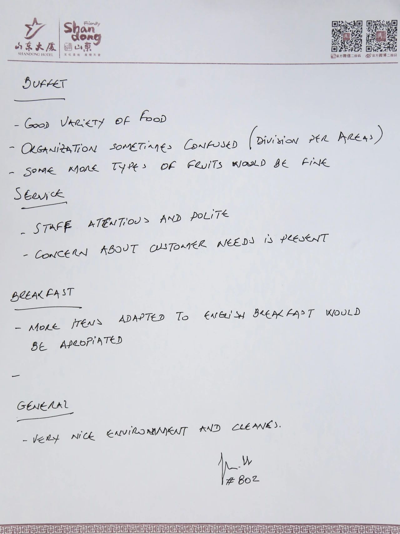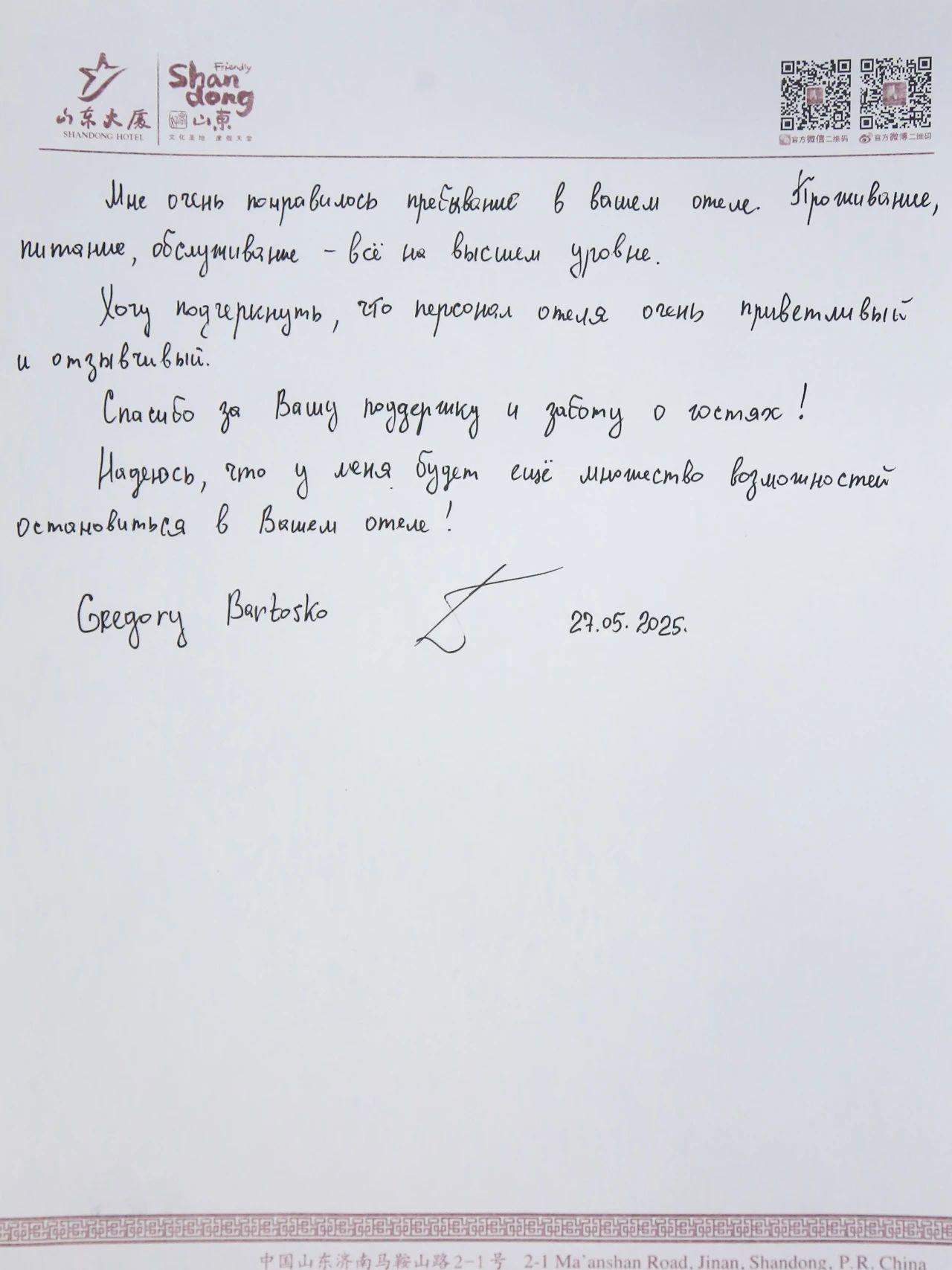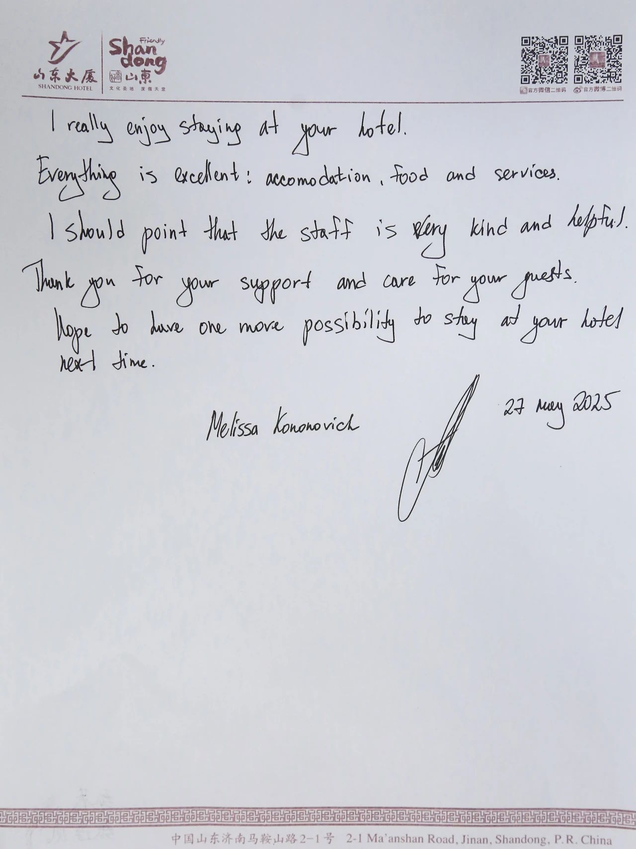 山东大厦累计收到各国嘉宾手写的感谢信近百封,字里行间涌动着对大厦LOVE式服务的高度认可。这些跨越语言的真挚反馈,既是对大厦全体干部员工匠心付出的生动注脚,更是文明互鉴的温暖印记。