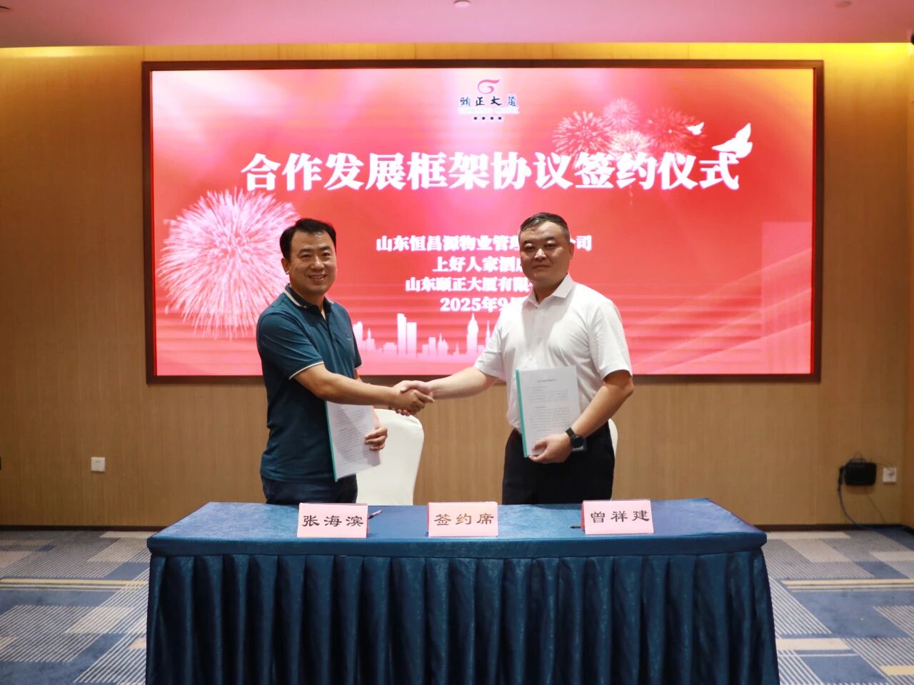 2025年9月10日下午,颐正大厦三楼颐康厅内氛围热烈、喜气盎然,颐正大厦与山东恒昌源物业管理有限公司、上好人家酒店在这里隆重举行合作发展座谈会暨签约仪式。此次跨界携手,既是颐正大厦深入贯彻集团“融转新”战略部署的重要实践,更以工程技术资源市场化运作为核心突破口,旨在通过优势资源的跨领域输出,激活市场拓展动能、强化品牌输出效能、实现多方双向赋能,并推动标准化运营体系升级,为颐正高质量发展注入新活力。颐正大厦党支部书记、董事长王美君、恒昌源物业总经理刘涛、上好人家酒店总经理张海滨等出席仪式,共同见证这一重要时刻。